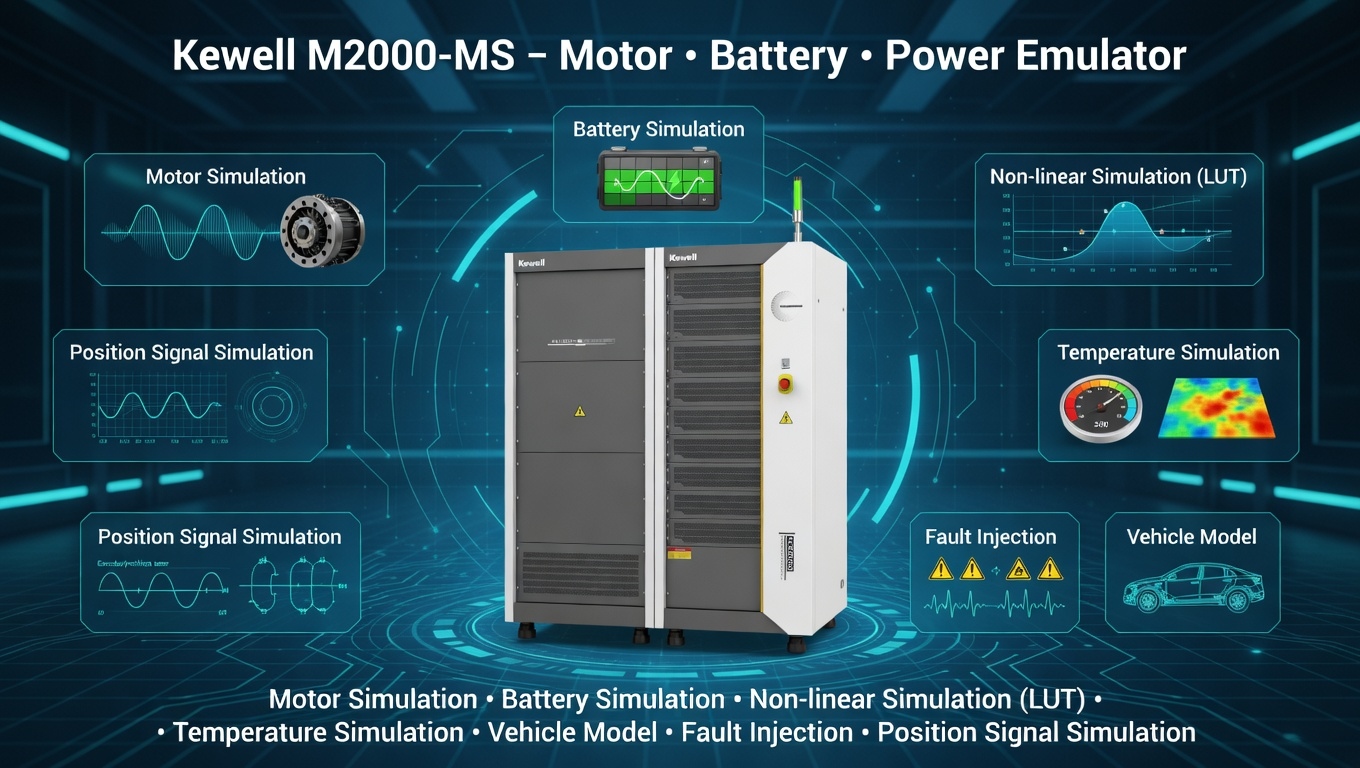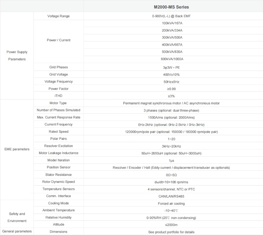 M2000-MS Serisi E-Motor Emülatörü (EME), statik motor + yük simülasyonunu entegre eden yeni bir güç elektroniği ürünüdür. Üçüncü nesil geniş bant aralıklı SiC güç yarı iletken cihazlarına dayanan seri, oldukça modüler ve standartlaştırılmıştır.