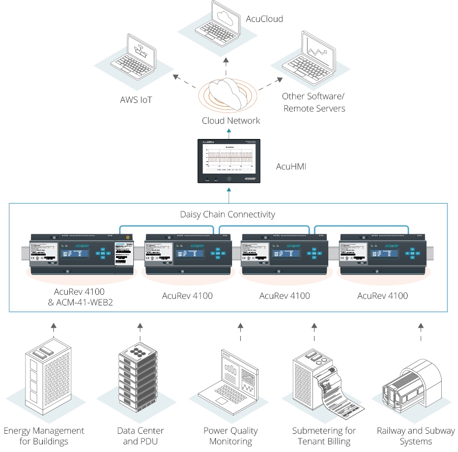 AcuRev 4100 Çoklu Şebeke Analizörler daha çok iletim sistemlerinde, dağıtım fiderlerinde birden fazla şebekenin izlenmesinde ve fabrikalarda dağıtım panolarında enerji kalitesi ölçmenin yanı sıra enerji tüketimleri, nötr akımları, harmonik kirlenmesi, K faktörü, Tff faktörü gibi onlarca parametreyi çok hasas bir şekilde ölçerek ekranlar, öte taraftan cihaz sahip olduğu modüler yapı ile dijital girişlere gelen verileri SEO olarak zaman pulu atarak raporlar böylelikle   AcuRev 4100 serisi şebeke analizörleri sadece iletim, dağıtım ve fider noktalarının AC parçalarını ölçmekle kalmaz aynı zamanda fider açmalarını yada mekanik açma kapamalarınıda zaman pulu ile raporlar, saha personeli isterse cihaz limit aşımlarında bir yerleri koruma altına alabilir, yada bir yerleri uzak noktadan açma kapamalarlada kontrol edebilir, AcuRev Güç analizörü fabrika veya çoklu yaşam alanlarında harcanan, su, doğal gaz, ısı vb bir çok büyüklüğü rapaorlayabilme yeteneğine sahiptir, Cihaz kendisine müdahele edenin şifresini, müdahale tarihini zaman pulu ile neleri sildiği konusunu silinmez bir şekilde hafızaya kayd etme özelliğine sahip çoklu bir enerji analizörü olarakta öne çıkar.