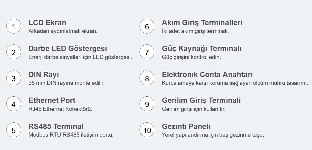 + Veri sorgulama ve yapılandırma için RS485 üzerinden Modbus RTU ve Ethernet üzerinden Modbus TCP/IP