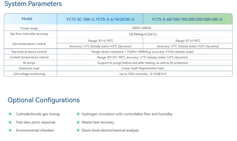 FCTS-S Serisi, yakıt hücresi yığınları için doğru, güvenilir ve kullanışlı bir test platformu sağlamayı amaçlamaktadır. Sistem esas olarak gaz akış ve basınç kontrol ünitesi, gaz sıcaklık ve nem kontrol ünitesi, termal yönetim sistemi, güvenlik koruma ünitesi, elektronik yük ve hücre voltajı izleme ünitesinden oluşmaktadır. Test platformu tarafından çevrimiçi veri izleme ve işleme, test edilen yığının performansının, hizmet ömrünün, güvenilirliğinin ve güvenliğinin analizini sağlar. Yakıt hücresi yığınlarının Ar-Ge, kalibrasyon ve EOL testlerinde kullanılabilir.