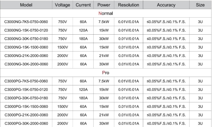 C3000 Serisi, geniş voltaj aralığı, yüksek dinamik performans ve ultra yüksek güç yoğunluğuna sahip, yüksek hassasiyetli programlanabilir bir DC güç kaynağıdır. Otomatik aralık çıkışı ve esnek voltaj ve akım kombinasyonları sunan C3000 Serisi, fotovoltaik, elektrikli araç ve havacılık gibi sektörlerde yaygın olarak kullanılmaktadır.